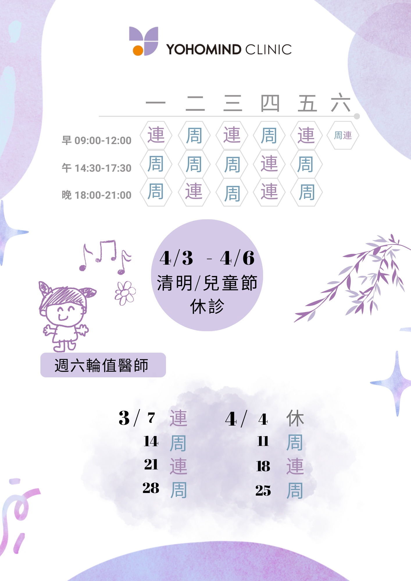 ‖ 心悠活診所 ‖ 3、4 月門診公告